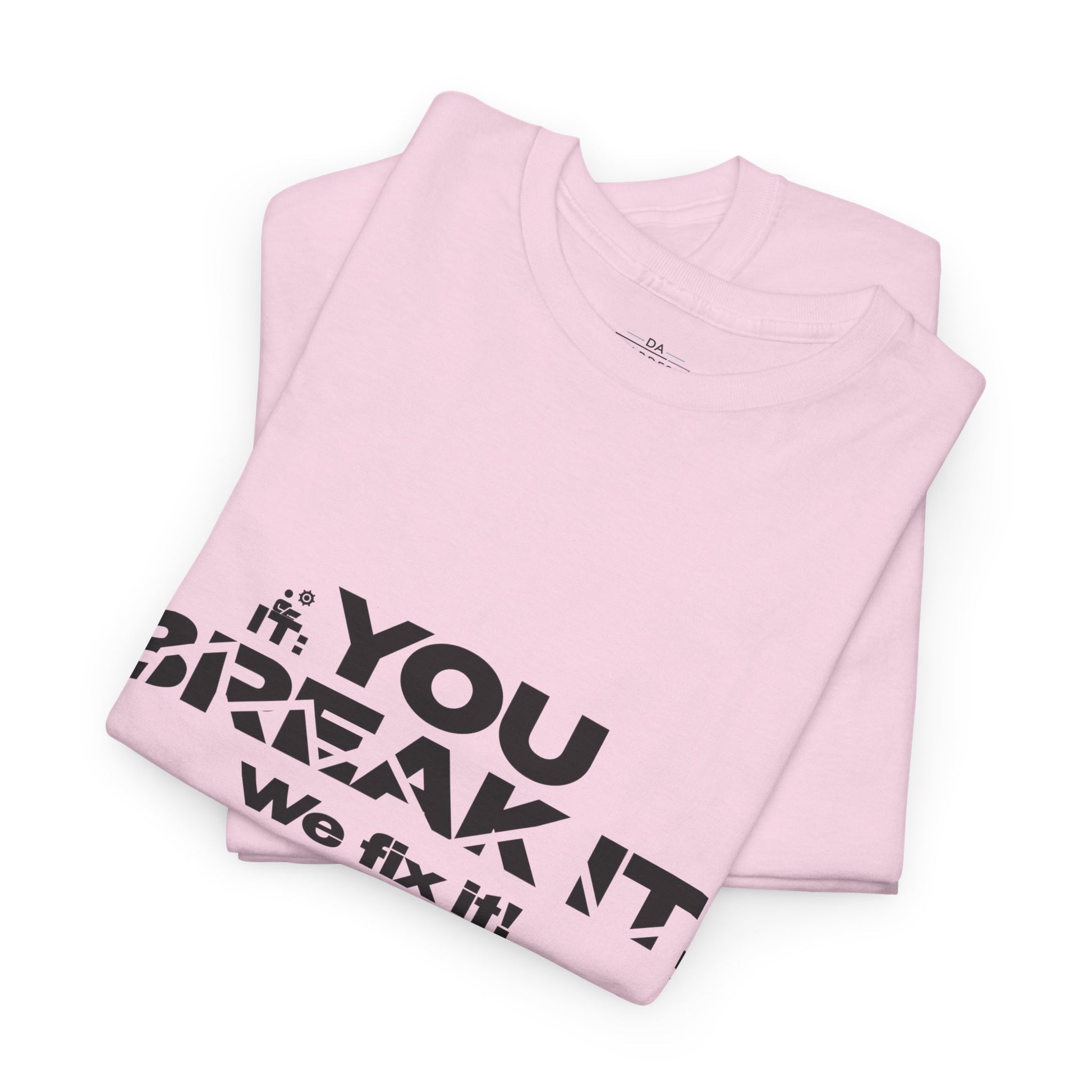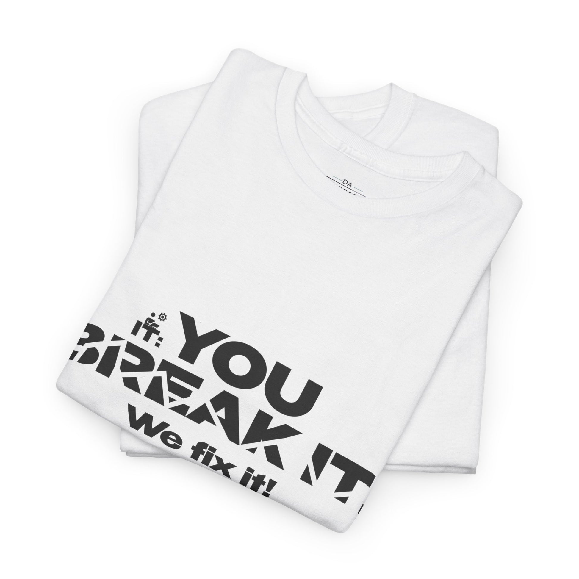 A funny 'IT: You break it, we Fix it' print T-shirt perfect for IT professionals. This shirt adds a touch of humor to your wardrobe and is a great conversation starter. It's relevant for tech-savvy individuals and can be worn casually or to tech-related events. Ideal for birthday gifts, geek celebrations, and everyday wear.