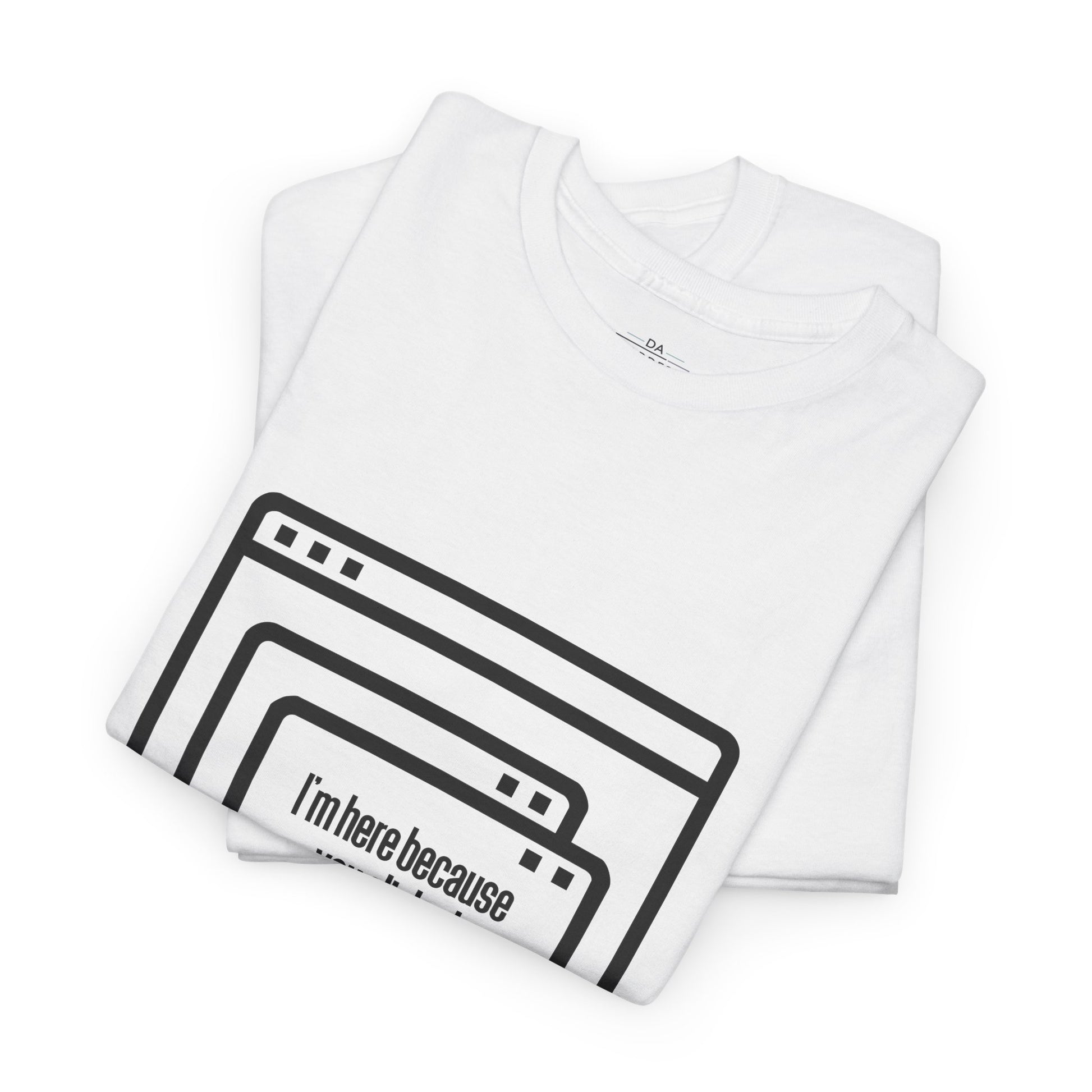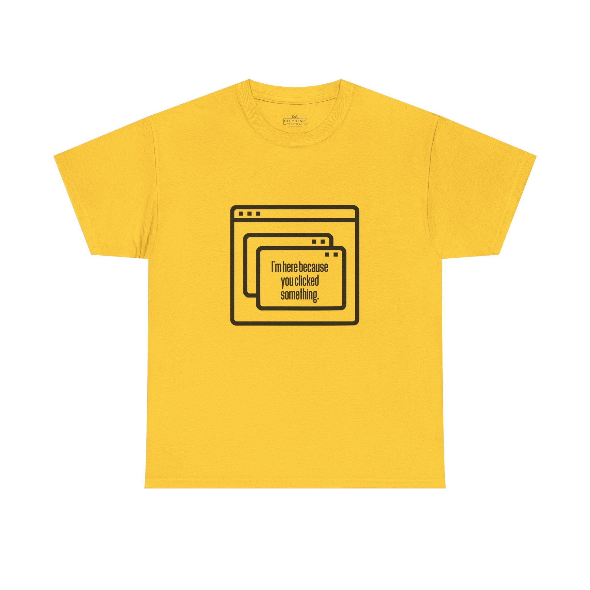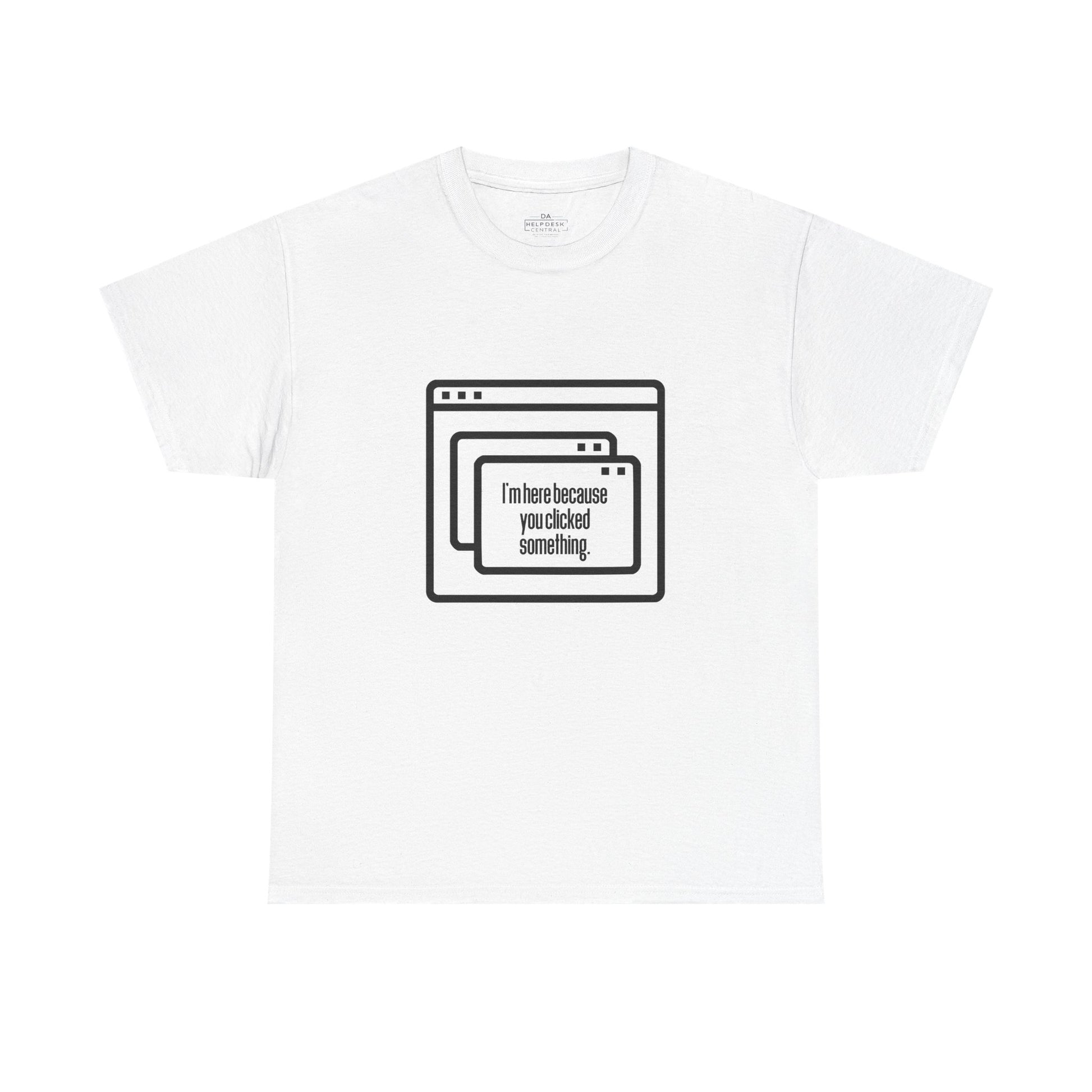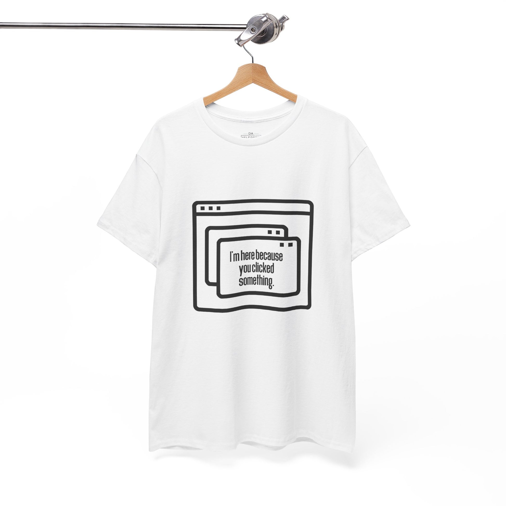 A print tee with the words 'i'm here because you clicked something' designed for IT professionals. This tee gives off a casual and humorous vibe, perfect for everyday wear or as a conversation starter at tech-related events. Ideal for IT professionals and computer enthusiasts. Relevant for casual wear, tech-related events, IT-themed occasions