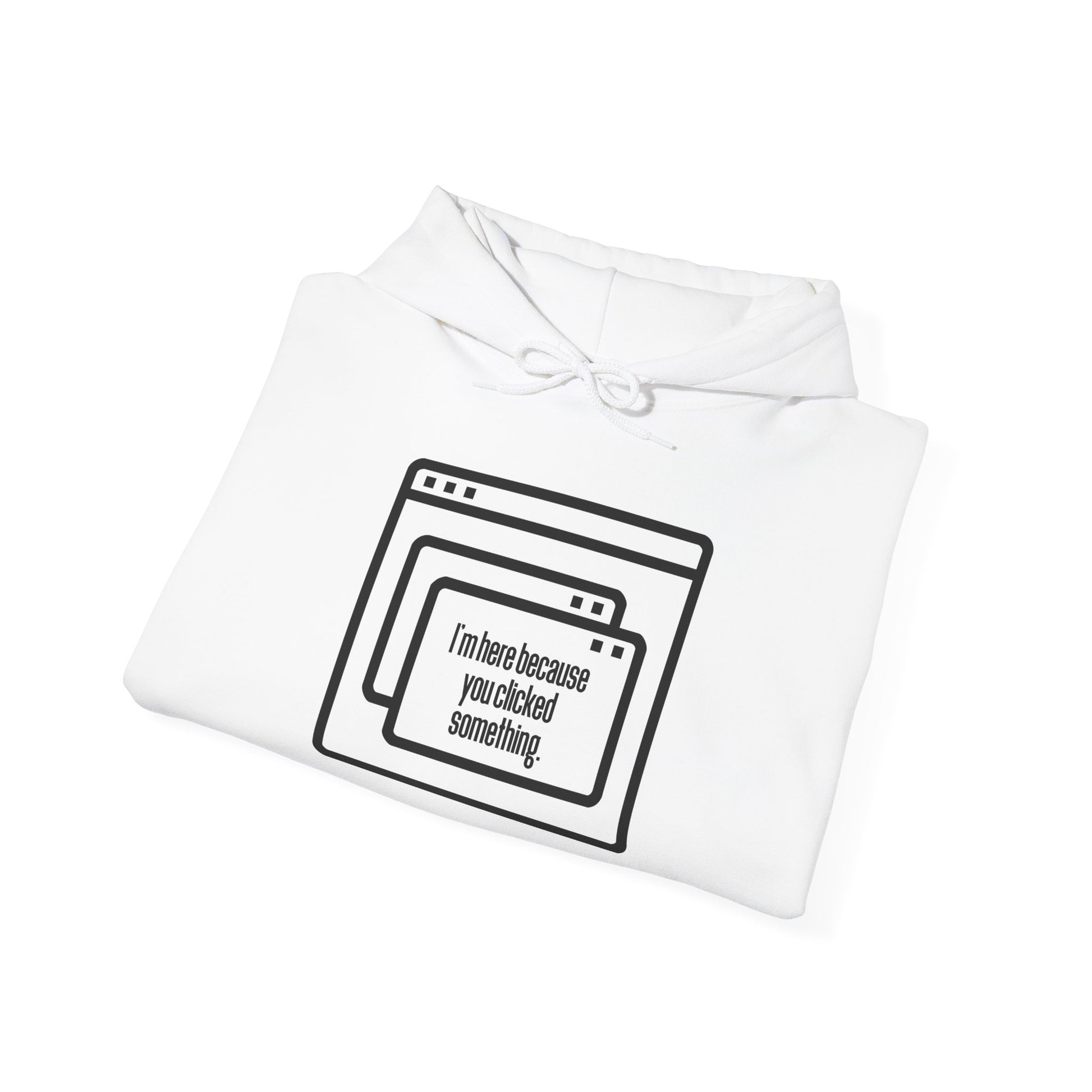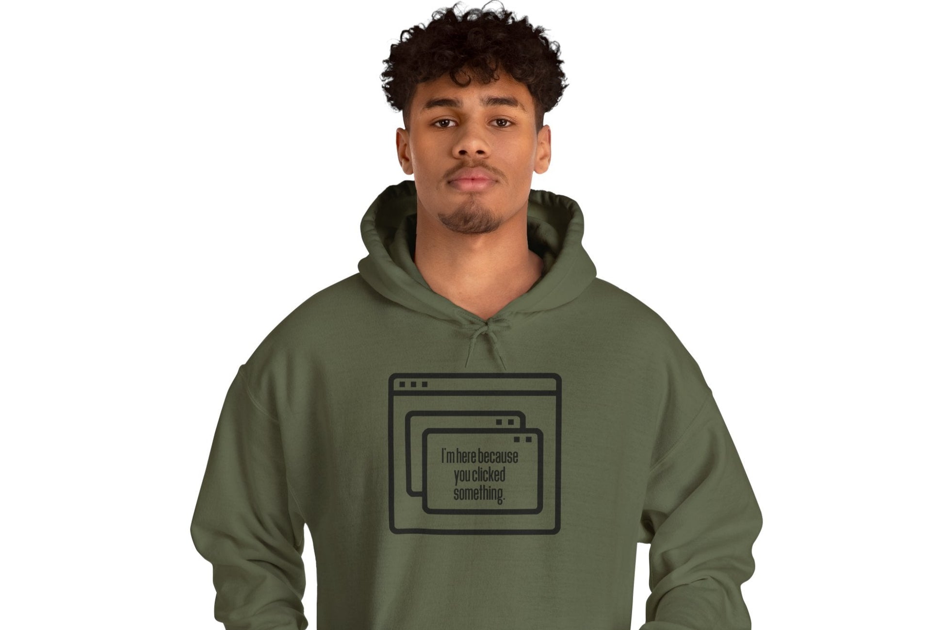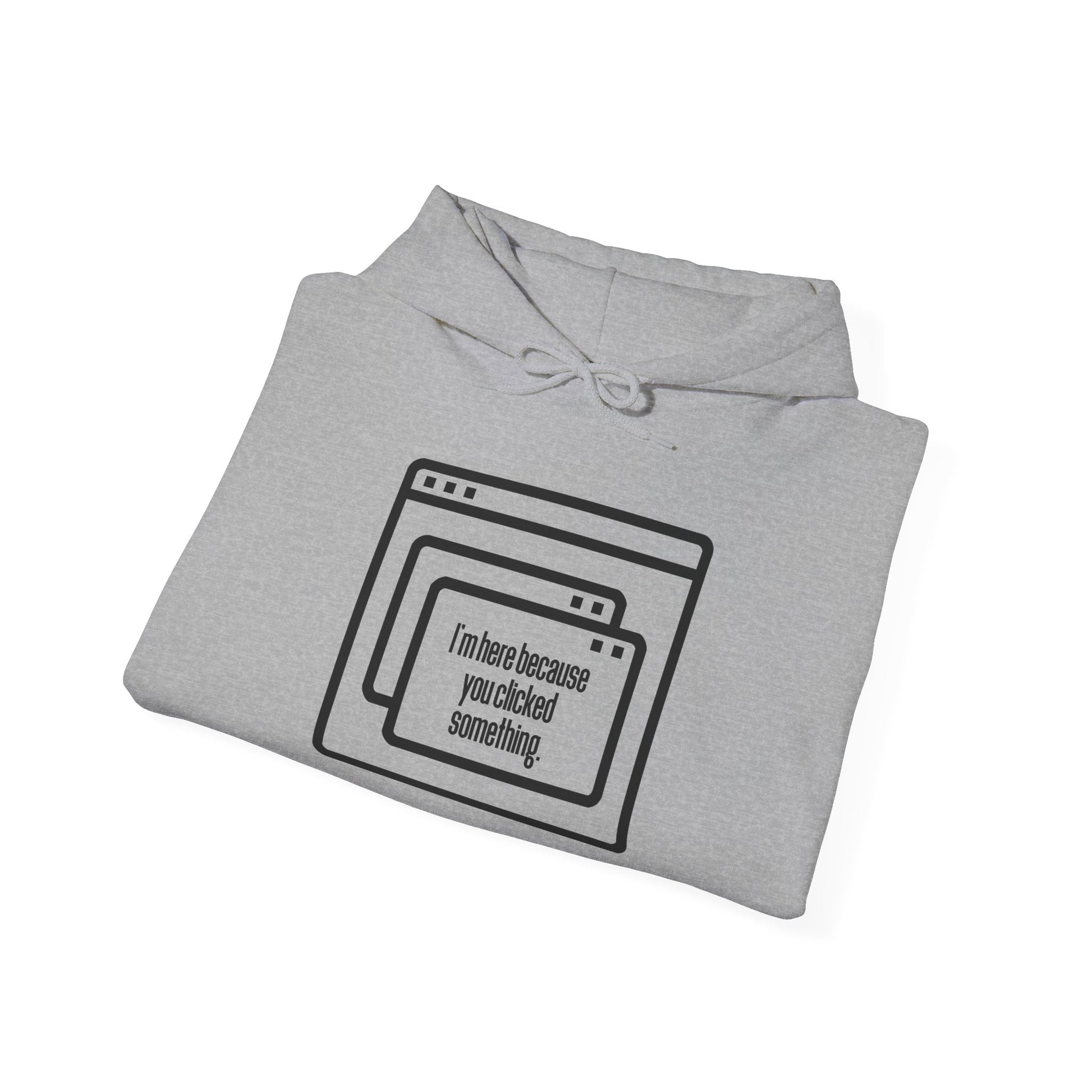 A cozy and stylish hoodie with the print 'I'm here because you clicked something'. Perfect for tech-savvy individuals with a sense of humor. Ideal for casual wear or as a gift for computer enthusiasts or IT professionals. Relevant for holidays like April Fools' Day or birthdays of tech lovers.