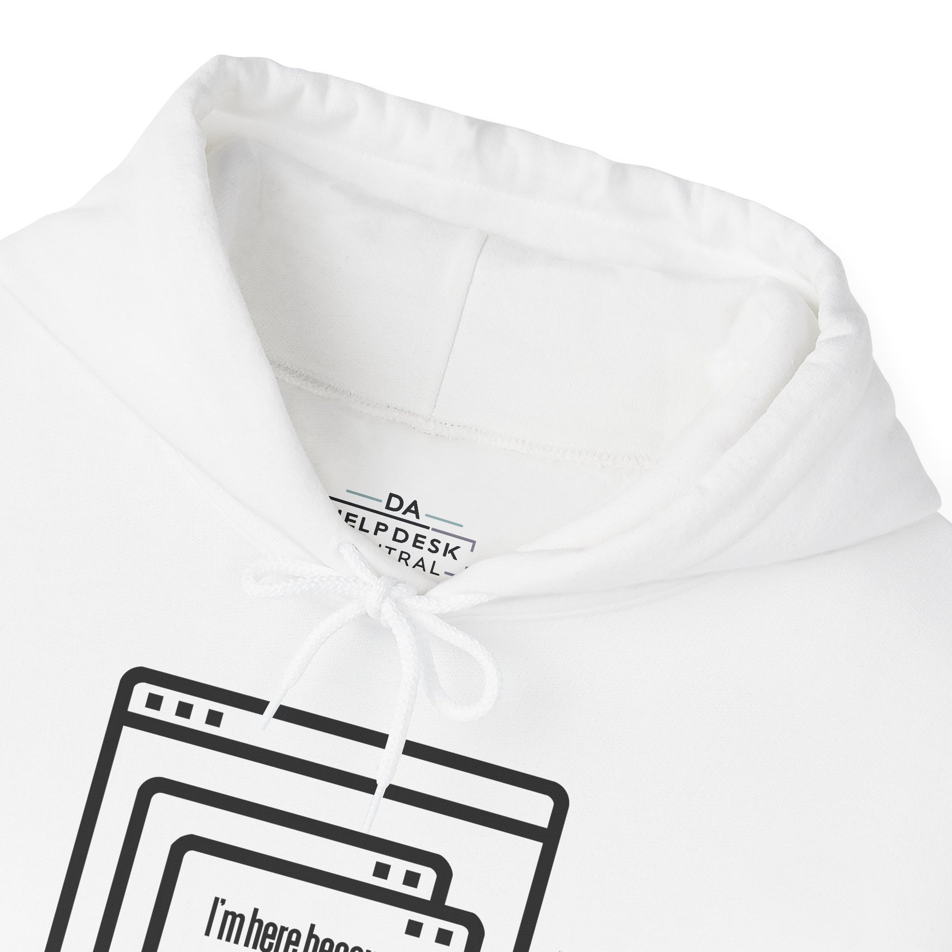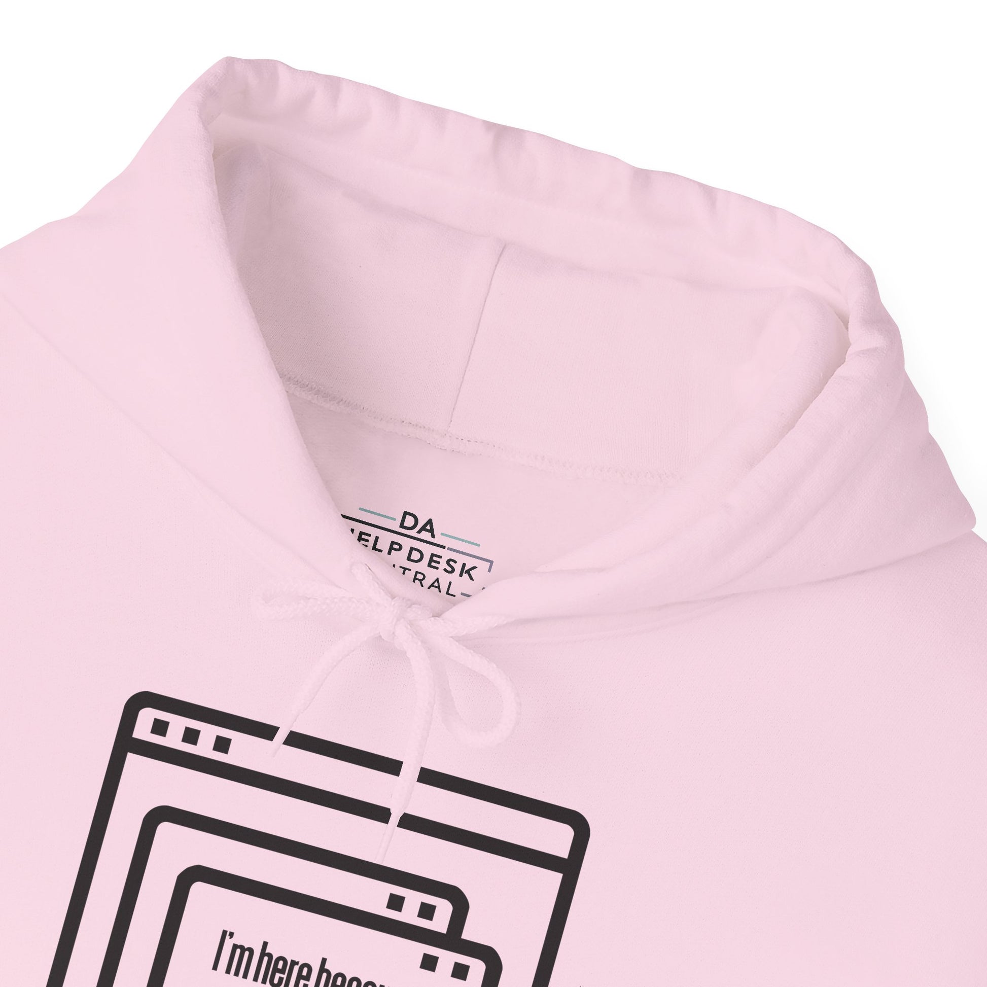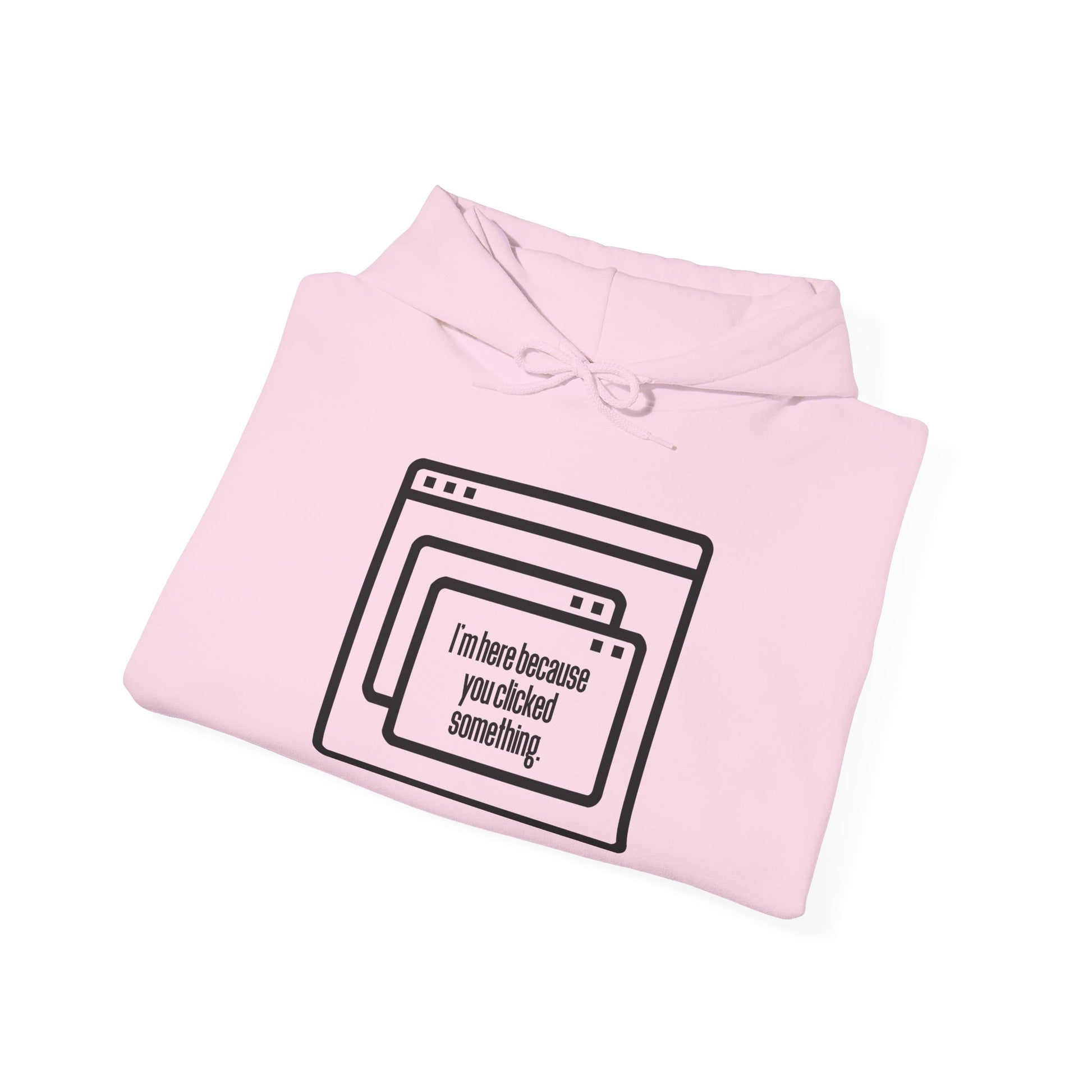 A cozy and stylish hoodie with the print 'I'm here because you clicked something'. Perfect for tech-savvy individuals with a sense of humor. Ideal for casual wear or as a gift for computer enthusiasts or IT professionals. Relevant for holidays like April Fools' Day or birthdays of tech lovers.