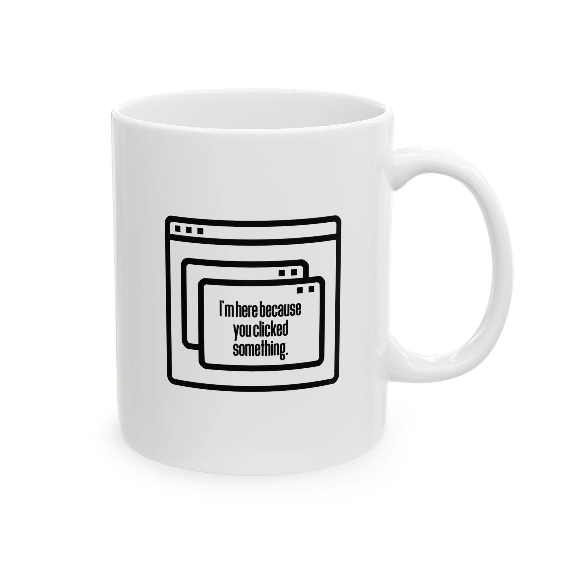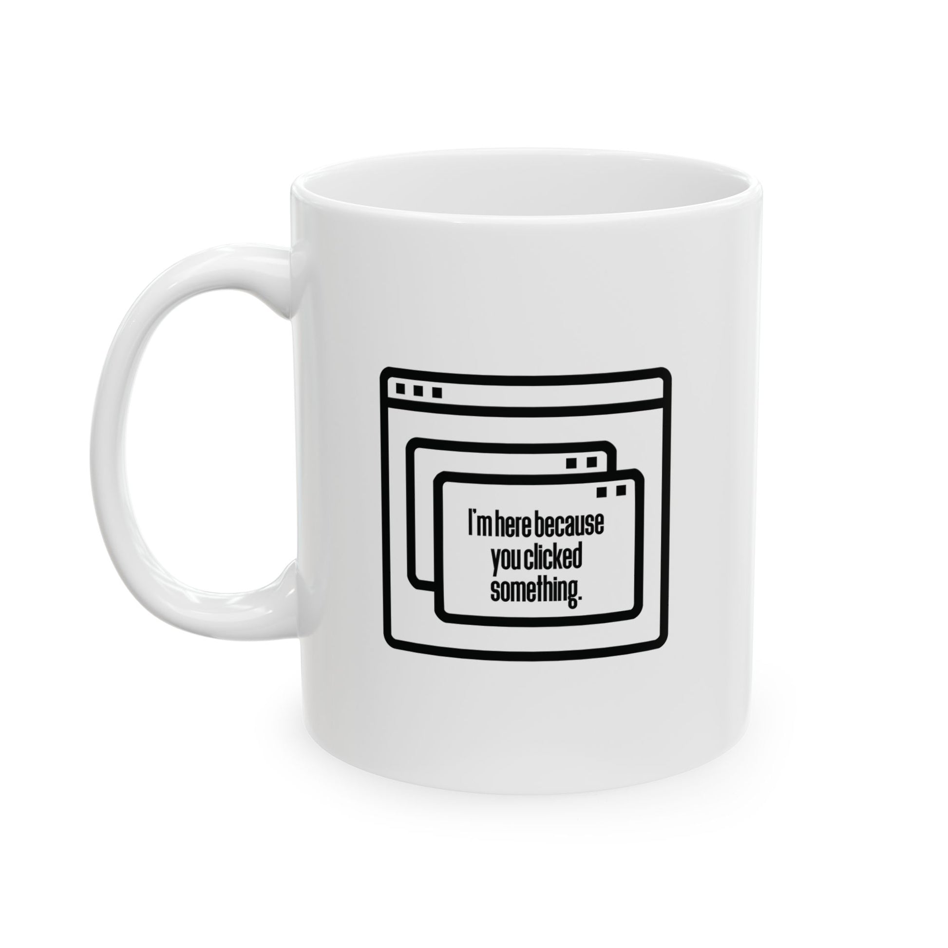 This ceramic mug is perfect for those who need to relax with a hot drink. With a design that reads 'I'm here because you clicked something', this mug exudes a calming vibe perfect for those who want to relax throughout the day. It's suitable for anyone looking to add some fun and relaxation to their daily routine or as a gift for tech-savvy individuals. This mug is ideal for holidays, birthdays, or just to show appreciation to a friend or colleague.
